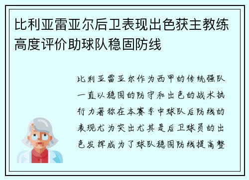 比利亚雷亚尔作为西甲的传统强队,一直以稳固的防守和出色的战术执行力著称。在本赛季中,球队后防线的表现尤为突出,尤其是后卫球员的出色发挥成为了球队稳固防线、提高整体战斗力的关键所在。比利亚雷亚尔的主教练也多次对后卫球员的表现给予了高度评价,认为他们不仅为球队的防守提供了保障,也为进攻提供了有效支援。这篇文章将从四个方面深入分析比利亚雷亚尔后卫在比赛中的表现,以及他们如何通过卓越的个人技术、出色的战术理解、强大的心理素质和团队合作精神,为球队稳固防线、取得优异成绩做出贡献。文章将详细探讨这些后卫球员在各自职责中的贡献,并结合主教练的评价,全面展示他们在比赛中的重要角色。