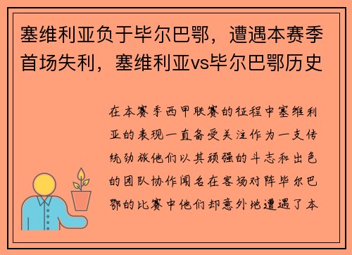 在本赛季西甲联赛的征程中,塞维利亚的表现一直备受关注。作为一支传统劲旅,他们以其顽强的斗志和出色的团队协作闻名。在客场对阵毕尔巴鄂的比赛中,他们却意外地遭遇了本赛季的首场失利,让球迷们感到些许意外。