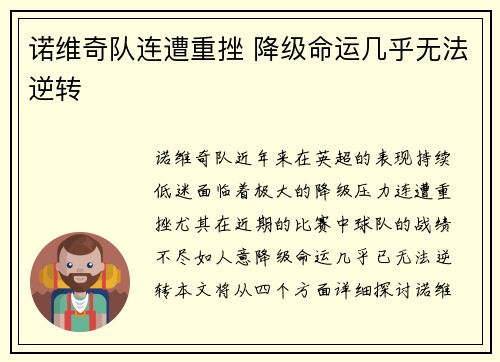 诺维奇队近年来在英超的表现持续低迷,面临着极大的降级压力。连遭重挫,尤其在近期的比赛中,球队的战绩不尽如人意,降级命运几乎已无法逆转。本文将从四个方面详细探讨诺维奇队在本赛季的困境,并分析为何他们的降级几乎已经注定。首先,我们将关注诺维奇队的阵容深度和人员配置,其次讨论球队战术的缺陷,再来看诺维奇队的心理状态及士气问题,最后将探讨他们与其他保级球队的竞争力。通过这些方面的分析,我们可以更清楚地了解诺维奇为何会陷入如此严重的降级危机。