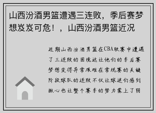 近期,山西汾酒男篮在CBA联赛中遭遇了三连败的困境,这让他们的季后赛梦想变得异常艰难。在常规赛的关键阶段,球队的连败不仅让球迷们感到揪心,也让整个赛季的努力蒙上了阴影。山西汾酒男篮,这支曾经在CBA赛场上叱咤风云的球队,如今正站在了悬崖边上。