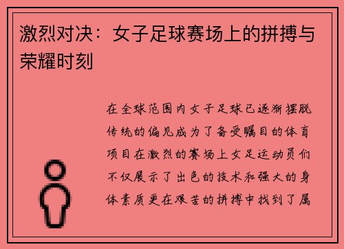女子足球在赛场上的拼搏与荣耀,是对每一位女性球员努力与坚持的真实写照。从最初的挑战到如今的光辉时刻,女性球员通过无数次的付出和努力,赢得了属于自己的辉煌成就。正是这些荣耀时刻让我们看到了女子足球的无限可能。