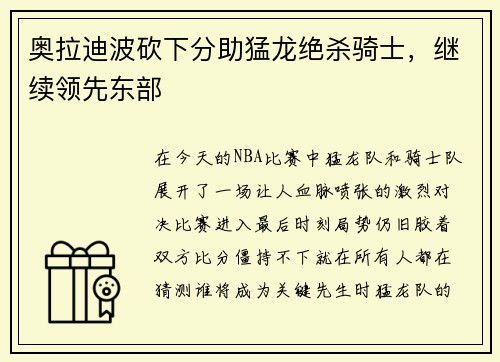 奥拉迪波的这种全面表现,无疑是猛龙队能够继续领先东部的关键因素之一。在他的带领下,猛龙队的整体实力得到了显著提升,球队的进攻和防守都变得更加均衡。而奥拉迪波个人的表现,也使他在球迷和媒体之间的声誉日益攀升。每场比赛,他都用实际行动证明了自己是东部强队的核心球员之一,而这种信心和实力,也让猛龙队的目标变得更加明确:继续保持在东部榜首,向着更高的荣誉进发。
